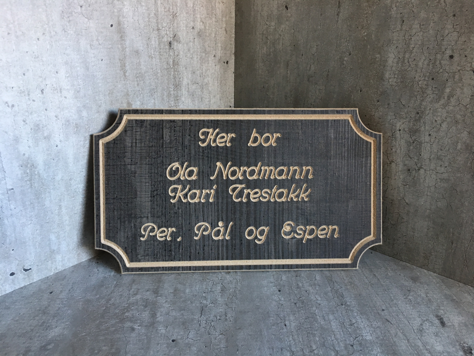 Fresing av skjenkebrett, husnummer, hytteskilt, dørskilt, bilder, hustavler og mye mer